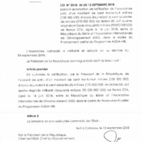 - Loi n° 2018-36 du 13 septembre 2018 portant autorisation de ratification de l’accord de prêt, d'un montant de cent trente-huit millions (138 000 000) d'euros équivalant à cent soixante-dix millions (170 000 000) de dollars US, soit quatre-vingt-dix milliards cinquante millions (90 050 000 000) de francs CFA, signé à Cotonou, le 14 juin 2018 entre la République du Bénin et l’Association Internationale de Développement (AID), dans le cadre du programme AQUA-VIE.
